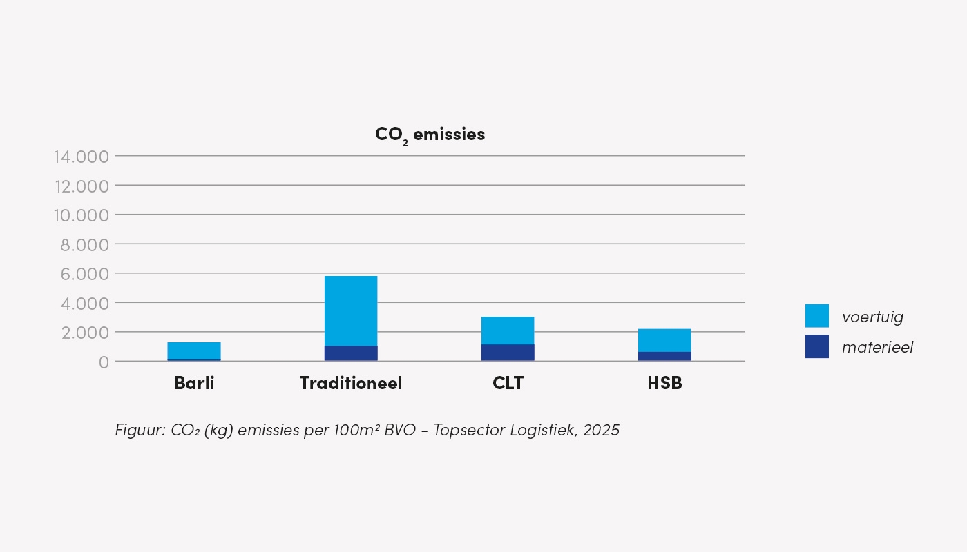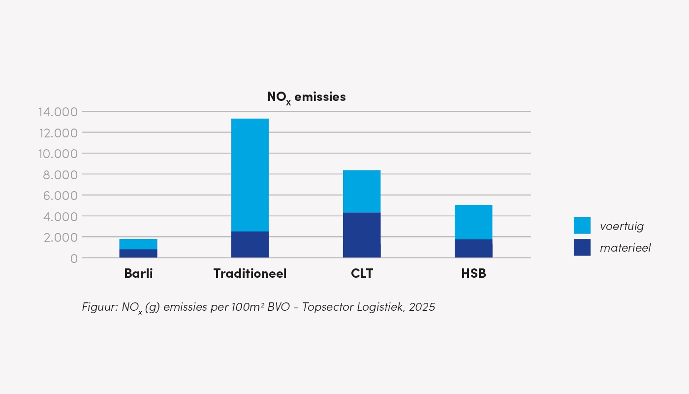 Uit een recente emissieanalyse van Topsector Logistiek blijkt dat de modulaire houtbouwmethode van Barli de uitstoot van stikstofoxiden (NOx) en CO₂ in de bouwfase drastisch reduceert. Metingen op een nieuwbouwproject in Born (30 woningen, 60 modules) wijzen uit dat de NOx-uitstoot 78% lager en de CO2-uitstoot 38% lager per 100 m² BVO dan bij traditionele bouw, na correctie voor verschillen tussen projecten. Ongecorrigeerd zijn de reducties zelfs −87% NOx en −77% CO2.