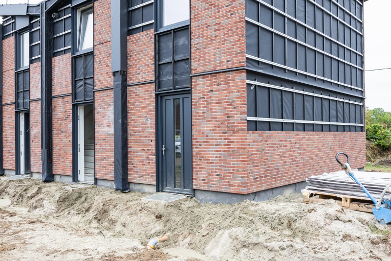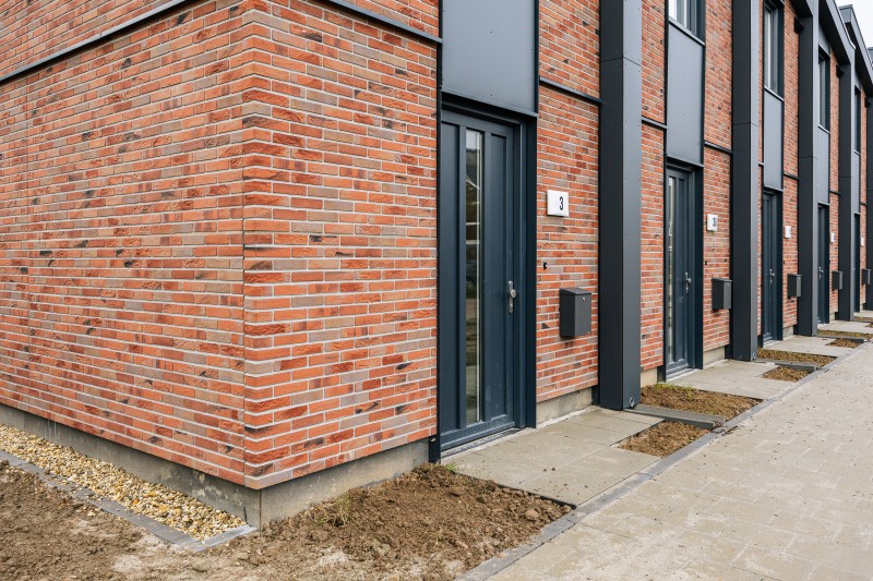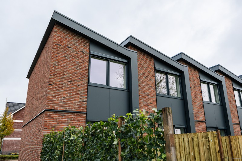 Willen we een superstrakke gevel? Dan moeten we heel secuur werken. Én slim. In Heerewaarden hebben we een kader tussen de woningen gemaakt, met afwatering erin. Projectleider Niels Versantvoort: “Daarmee onderbreek je het patroon van de gevelbekleding en zie je kleine afwijkingen niet. Wie de woningen bekijkt, ziet geen verschil met echte stenen.”